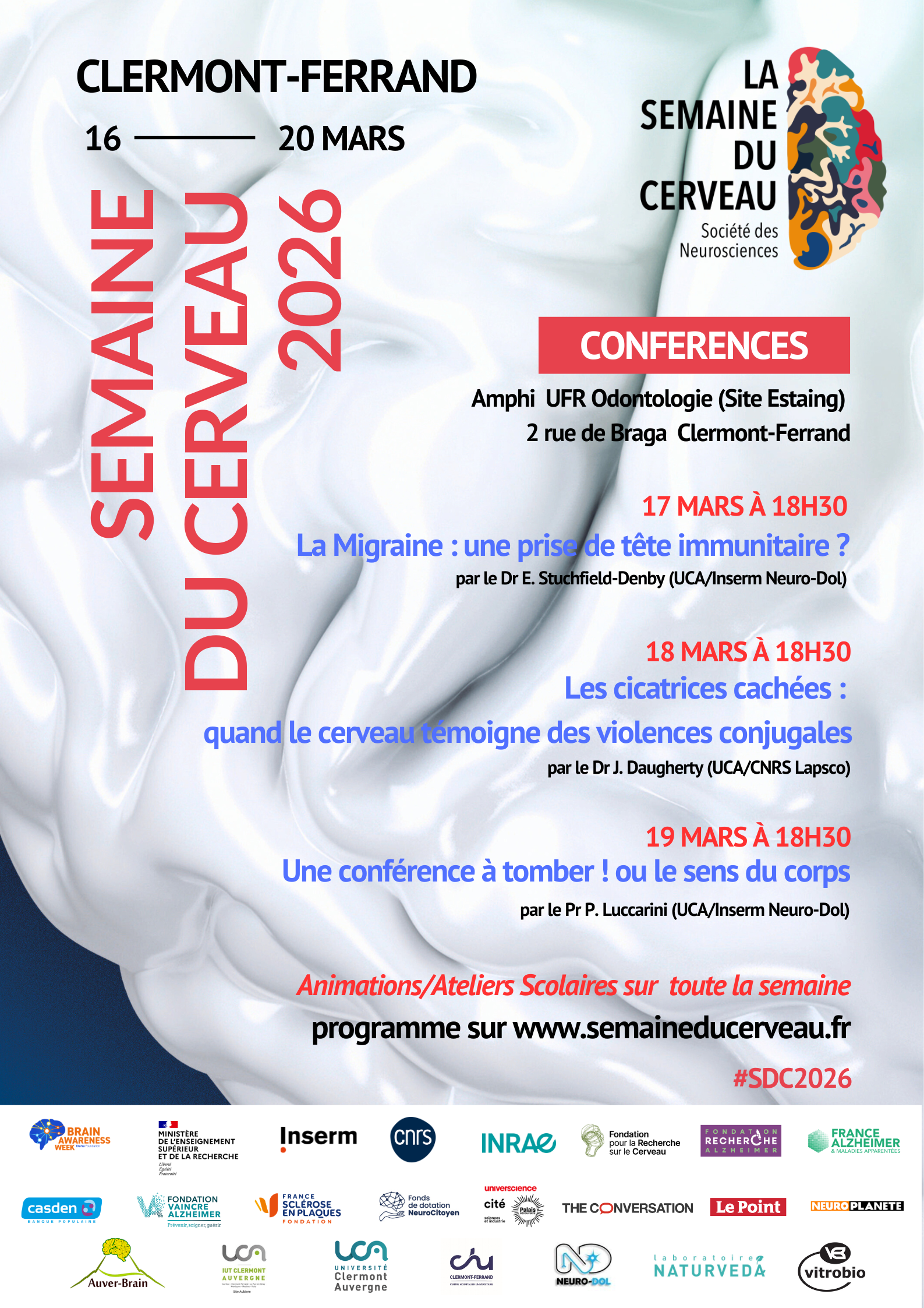 La Société des Neurosciences a le plaisir d’annoncer la tenue de la Semaine du Cerveau 2026, qui se déroulera du 16 au 20 mars en Auvergne