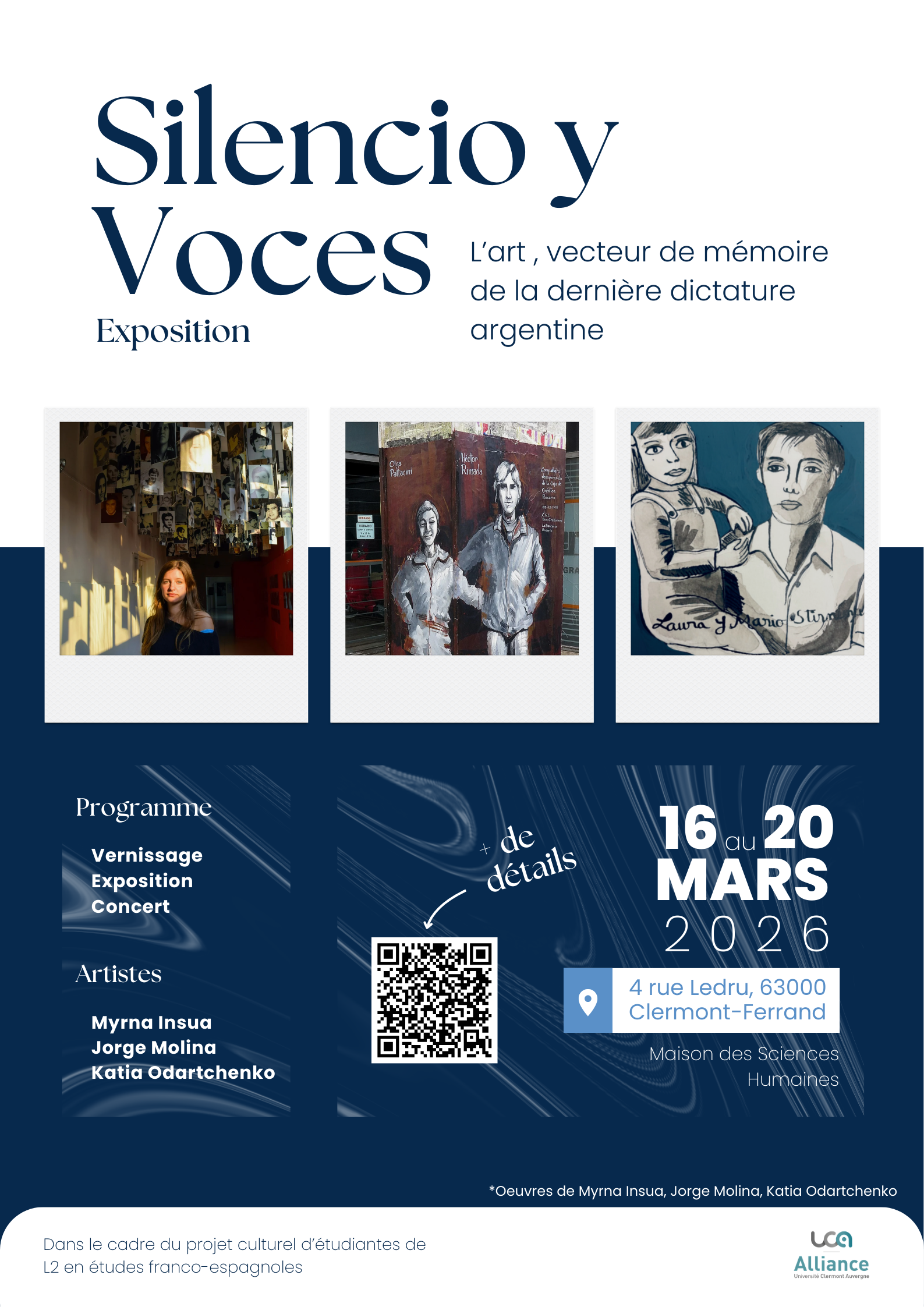 Dans le cadre de la journée d’études ? Argentine, 50 ans après le dernier coup d’?tat. Violence d’?tat et enjeux démocratiques ?, l'exposition "Silencio y Voces, l'art vecteur de mémoire de la dernière dictature argentine" aborde le thème à travers le point de vue de la mémoire autant passée qu'actuelle des évènements de la dictature.