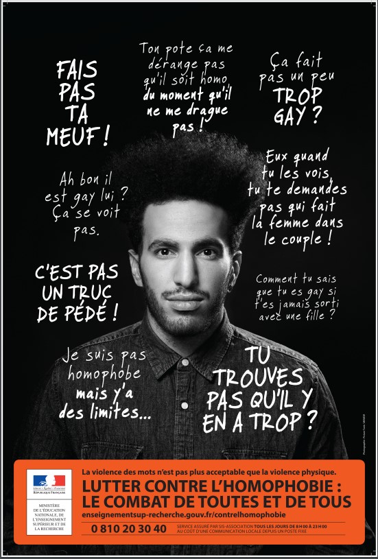 un jeu de quatre affiches qui reprennent des insultes ou propos communément entendus qui marquent profondément les étudiant-e-s gays, lesbiennes, bisexuels ou trans',