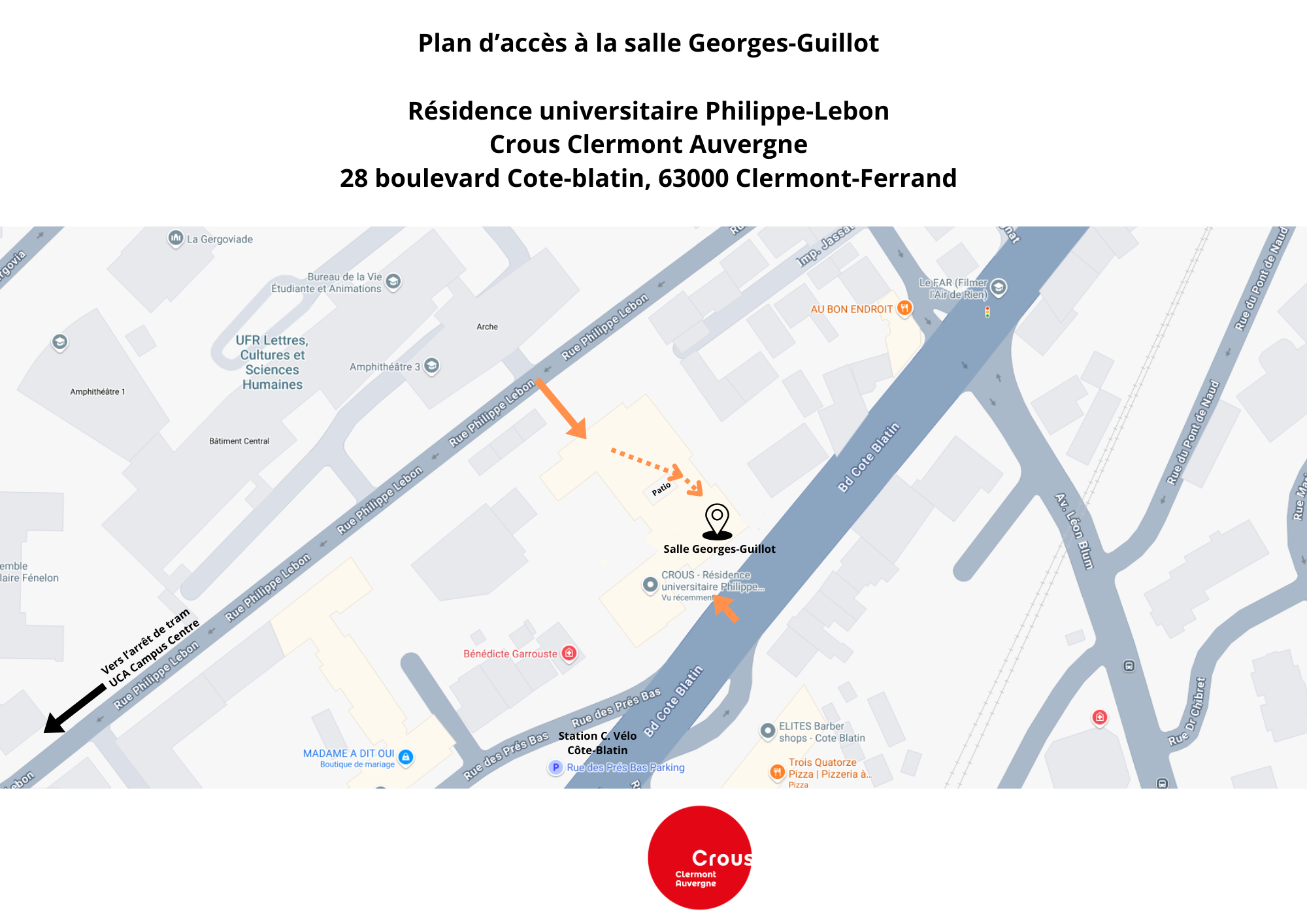 Lieu : salle Georges-Guillot, Résidence universitaire Philippe-Lebon, 28 boulevard Cote-Blatin, Clermont-Ferrand (voir photos et plan ci-dessous).